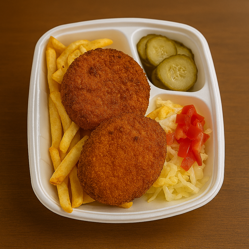 2 Chiftele De Post Pane (din Legume/soia), Cartofi Prăjiți Aurii, Murături (castraveți Murați Felii), Salată De Varză Proaspătă Cu Ardei Roșu. Fără Carne, Fără Lactate — 100% De Post.: