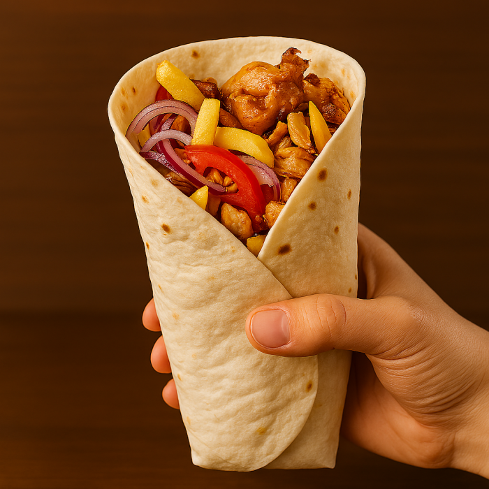 Pui marinat gătit la grătar vertical (rotisor), învelit în lipie proaspătă coaptă cu legume și sos tradițional.